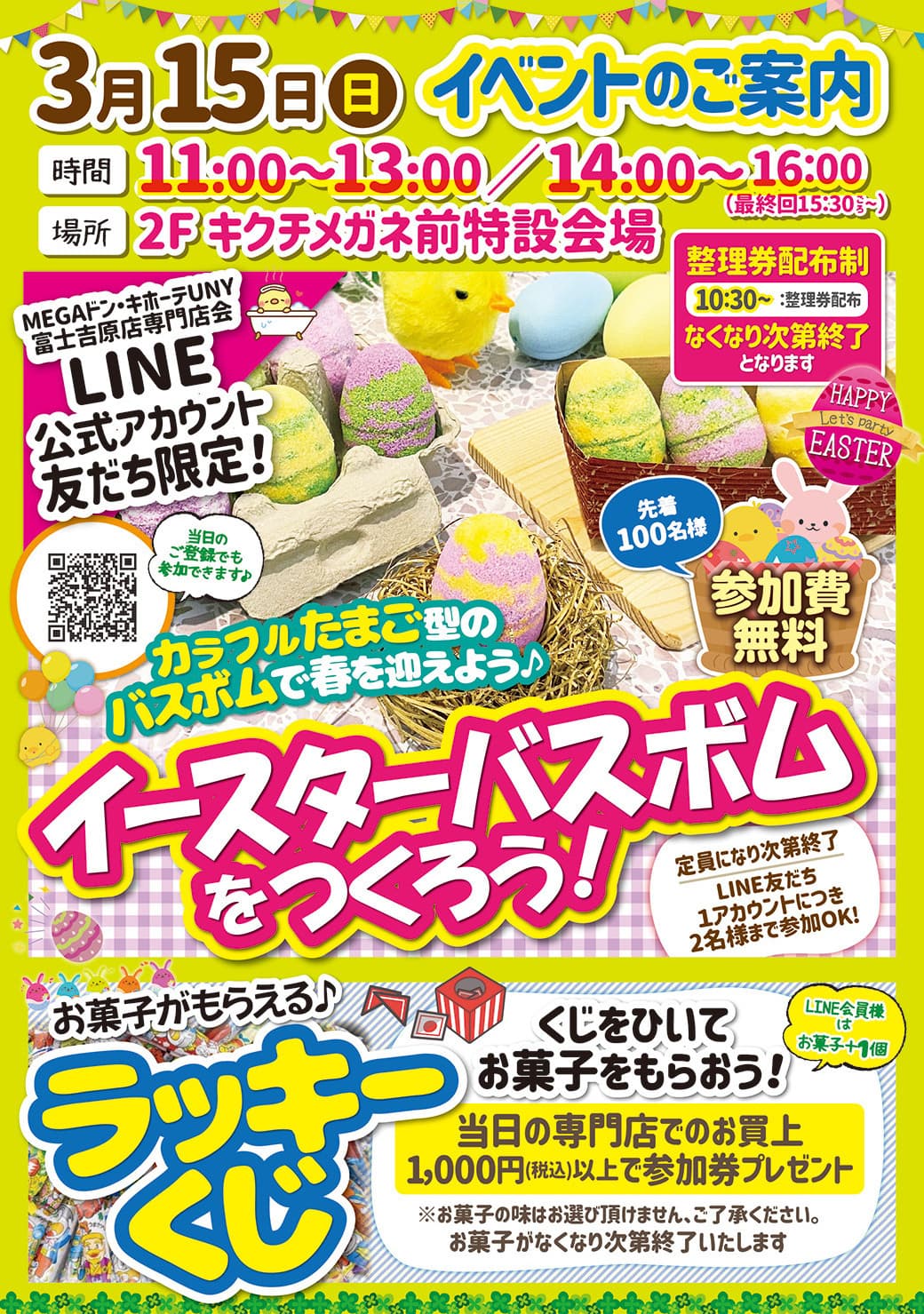 MEGAドン・キホーテUNY富士吉原店専門店会の最新情報やお得な情報をラインでお届けします!友だち追加はこちらからどうぞ! 2026年3月15日(日) イベントのご案内 専門店でのmajicaご利用開始のご案内 日曜日のお買い物はスタンプチャンス! NEWS 最新情報 {"articleType":"1","limit_article_num":"3","article_disp_offset":"0","article_disp_offset_num":"","article_new_offset":"1","article_new_offset_num":"5","blogs":[{"sid":"G7zTKxwDlrp_","categories":"","tags":"","order":"newer","name":"NEWS_fujiyoshiwarasenmontenkai","pathToFolder":"./blog/","topfile":"top.html","rss":"0"}]} [%article_date_notime_dot%][%new:New%] [%title%] [%lead%] 続きを読む READ MORE SPECIALTY STORES 専門店のご案内 1F 2F ACCESS アクセス